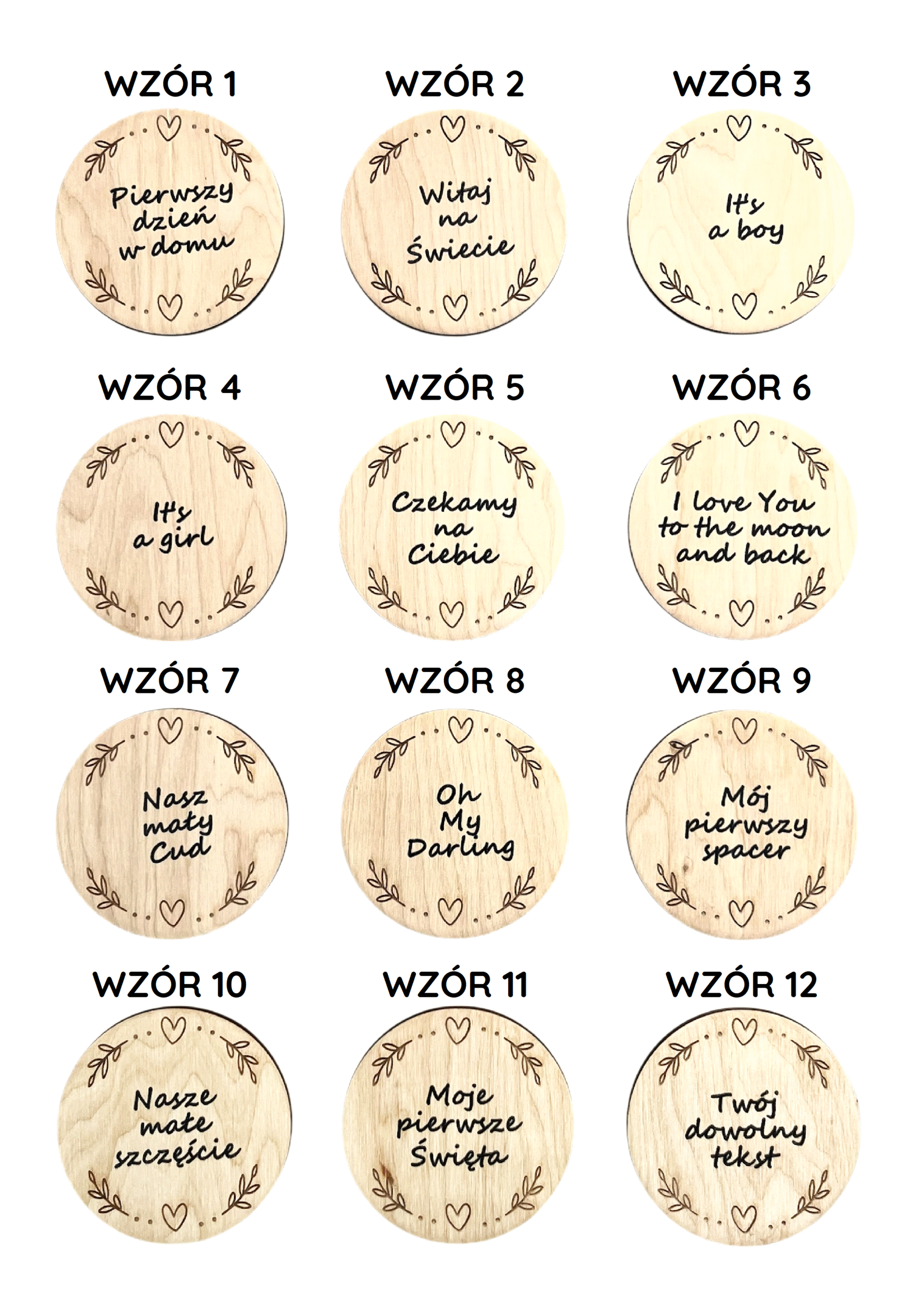 ZESTAW 15 DREWNIANYCH TABLICZEK DO SESJI FOTOGRAFICZNYCH NA PIERWSZY ROK ŻYCIA DZIECKA (12 miesięcy + imię dziecka + 2 tabliczki do wyboru).