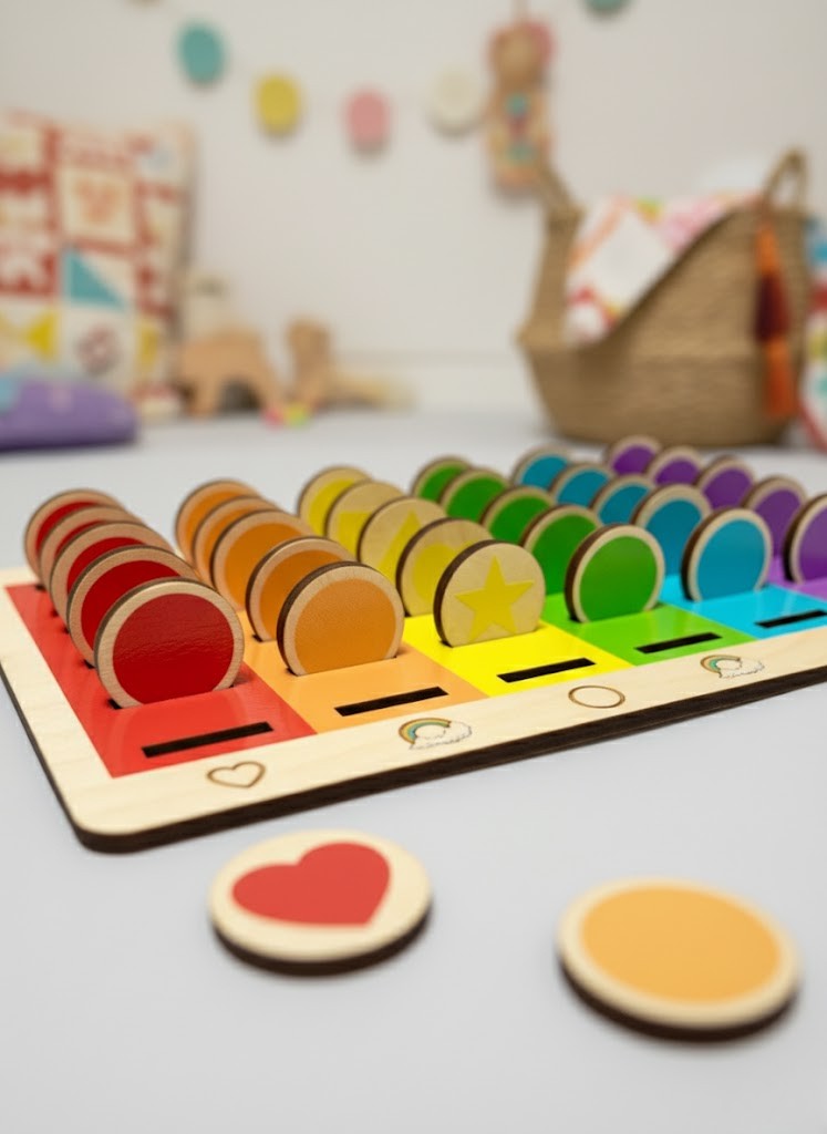 Drewniany sorter kolorów i kształtów to zestaw składający się z kolorowej bazy oraz 36, dopasowanych do niej, kółeczek. Kółeczka zostały zaprojektowane w taki sposób, aby jedna ich strona służyła do nauki i sortowania kolorów, a druga do nauki i sortowania kształtów.